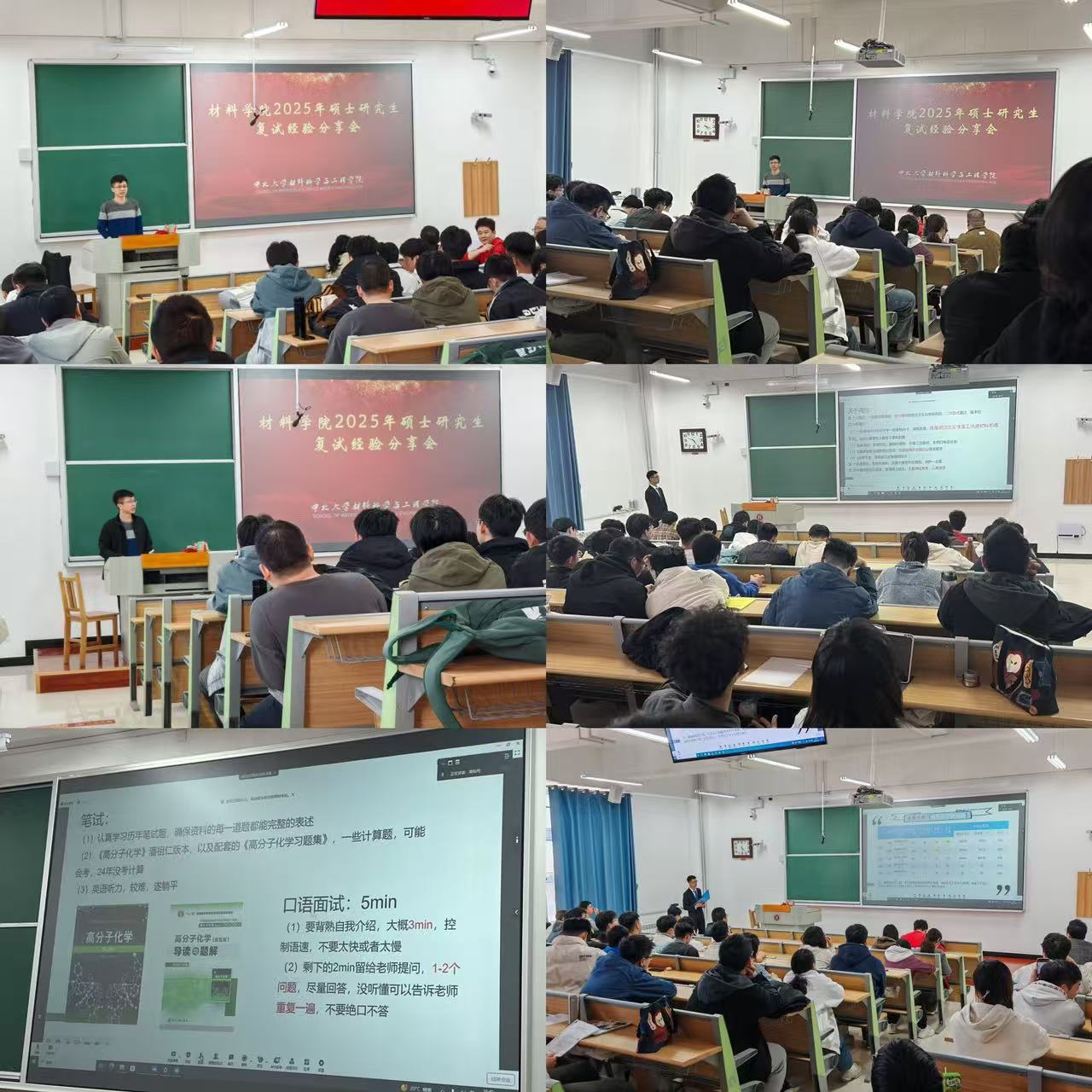 本次考研复试经验交流会圆满成功并取得了良好的效果。此次交流会使同学们不仅系统掌握了复试流程、面试技巧与调剂策略,更在心态调整与科研规划上获得启发,为毕业生及备战复试的同学们提供了宝贵的经验并注入了信心与力量。切实缓解了同学们备考的焦虑感,帮助其明晰方向、优化策略,让同学们有备而战。也让低年级的同学们提前了解了报考院校复试考试内容和流程,帮助同学们找准备考方向。复试不仅是能力的较量,更是心态的博弈希望同学们汲取今日所得,将压力转化为动力,在考场上绽放光芒。祝愿我院2024届材料考研学子复试顺利,成功上岸!