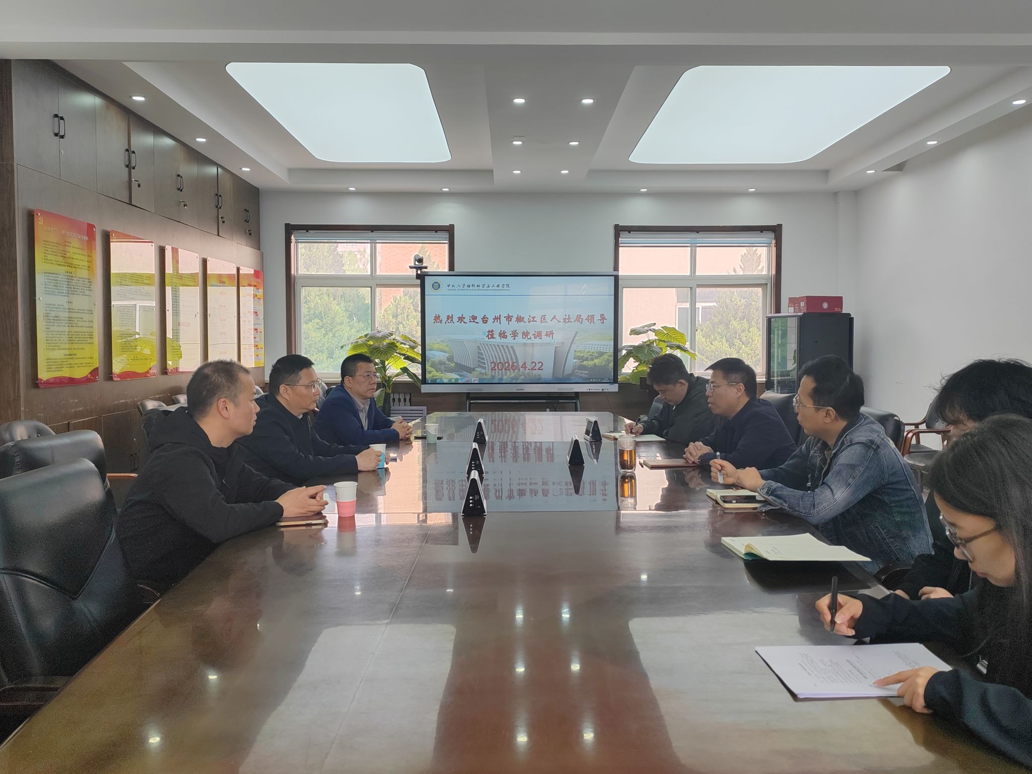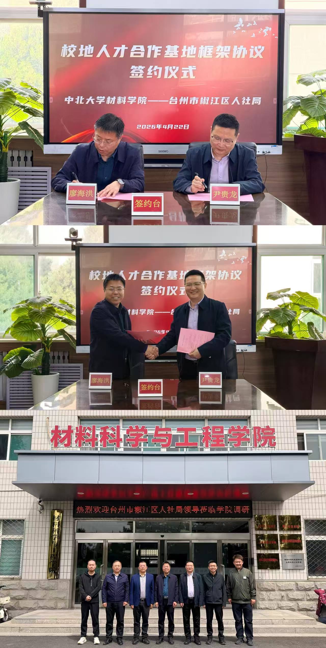 为深化校地协同合作、推进产才深度融合,助力毕业生高质量就业与区域产业高质量发展,2026年4月22日,台州市椒江区人力资源和社会保障局一行莅临中北大学材料科学与工程学院,开展校地人才合作座谈交流,并举行校地人才合作基地签约仪式,学院领导班子及椒江区人社局相关负责人共同参与本次活动。