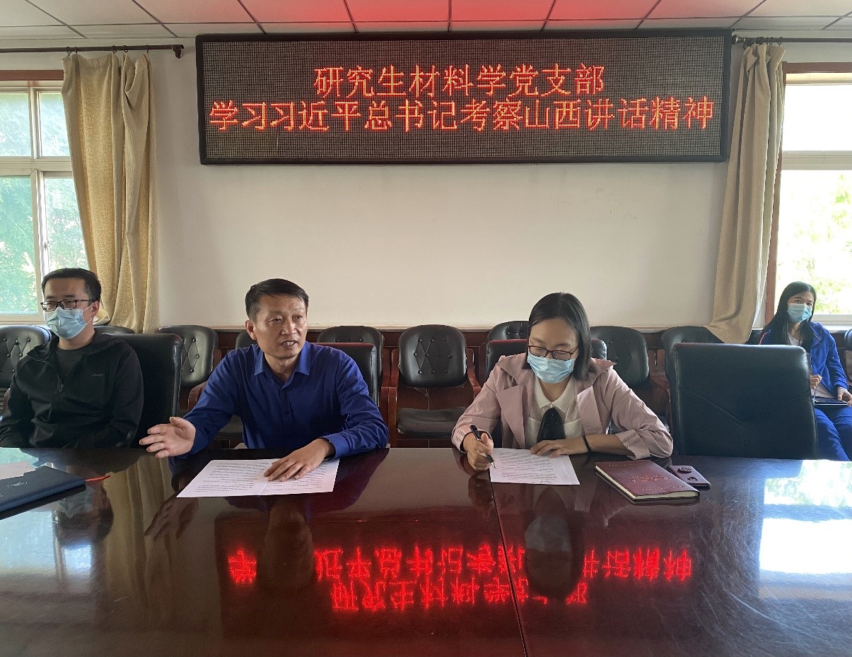 5月14日下午,中北大学材料学院研究生材料学党支部召开支部大会,集中学习习近平总书记考察山西重要讲话精神。会议邀请院党委书记薛亚奎同志参加,全体在校党员参会,未返校同志通过腾讯会议参加。会议由支部书记王燕同志主持。